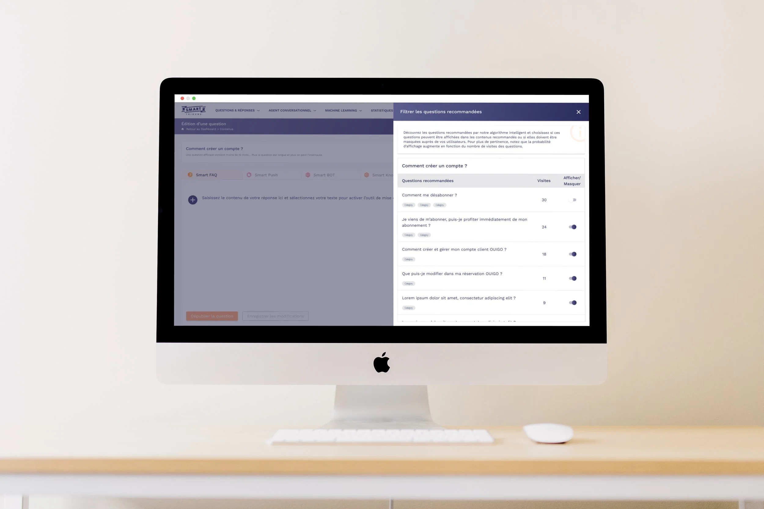 Back‑office recommendation engine letting admins show or hide content to tailor each suggested answer.
